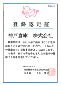 当社は、従業員の健康を重要な経営資源と捉え、従業員の健康維持・推進を積極的に行い、 より良い職場環境の整備に取り組んでいきたいと考えています。 その一環として、「健康宣言」を行い全国健康保険協会兵庫支部から『わが社の健康宣言』(登録認定証)を取得しました。 「健康宣言」とは、企業自らが「企業全体で健康づくりに取り組むこと」を宣言するものです。 当社は、今後も従業員一人ひとりの健康づくりに取り組んでまいります。
